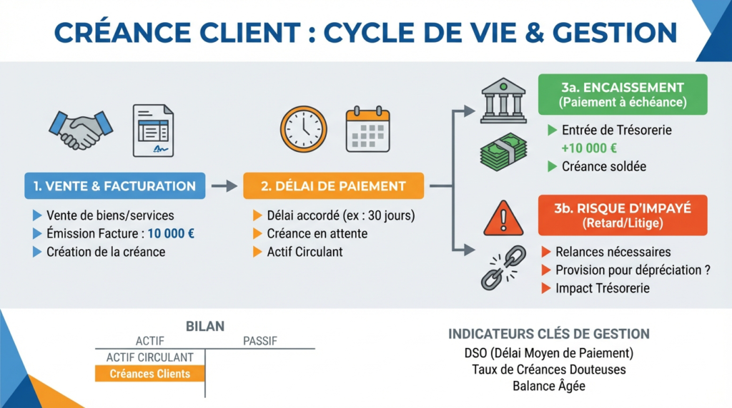 Une créance client correspond au montant qu’un client doit régler à votre entreprise suite à une vente de biens ou de services. Elle naît dès l’émission de la facture et perdure jusqu’au paiement effectif.
