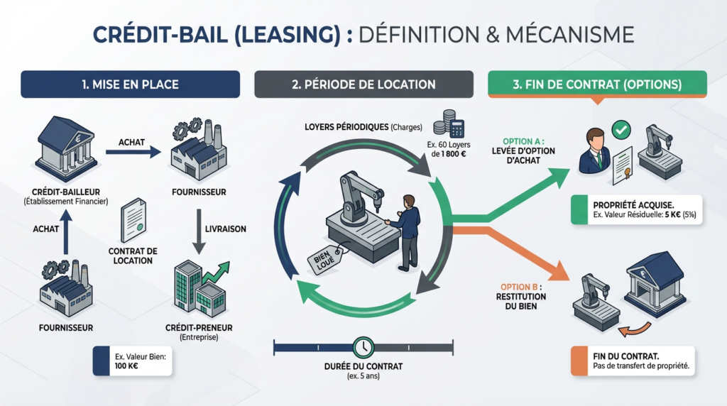 • Le crédit-bail (ou leasing) est une location avec option d’achat permettant de financer 100 % d’un investissement sans apport initial.